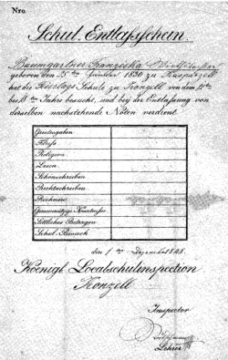 Feiertagsschule ade - Schulentlaßschein 1848 Ausgestellt vom Königl. Lokalschulinspektor, benotet wurden: Geistesgaben, Fleiß, Religion, Lesen, Schönschreiben, Rechtschreiben, Rechnen, Gemeinnützige Kenntnisse, Sittliches Betragen, Schulbesuch