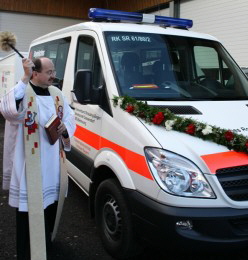 Pfarrer Walter Strasser segnet das neue MTW
